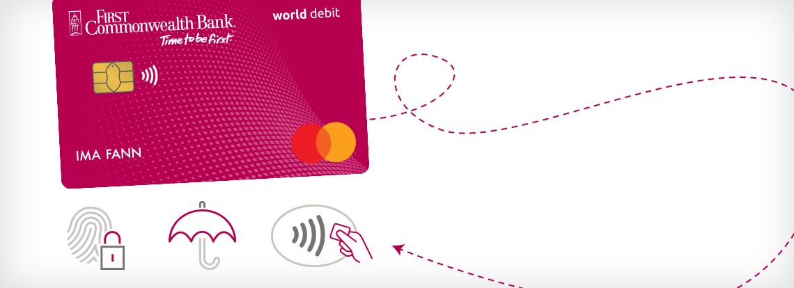 Our First Commonwealth Bank debit cards are packed with added security to give you access to your money in your Hometown checking accounts so that you can check out with confidence every time you shop, whether that's at the gas pump or using Apple PayTM, Samsung PayTM, Google PayTM and Garmin PayTM. You'll need a checking account to get a debit card, which can be opened online, in person or by calling 844.711.BANK (2265). If you already have an account, just ask at your local office or call 800.711.BANK (2265) to order your card.